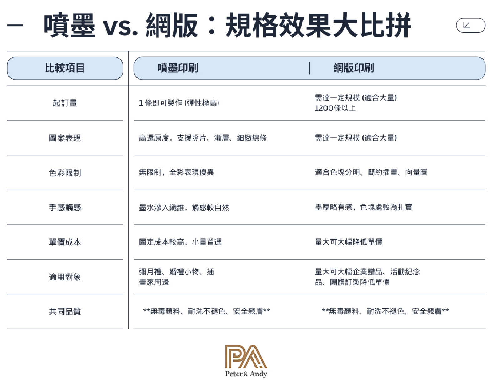 噴墨 vs. 網版:規格效果大比拼圖表,讓你一目瞭然最佳選擇。