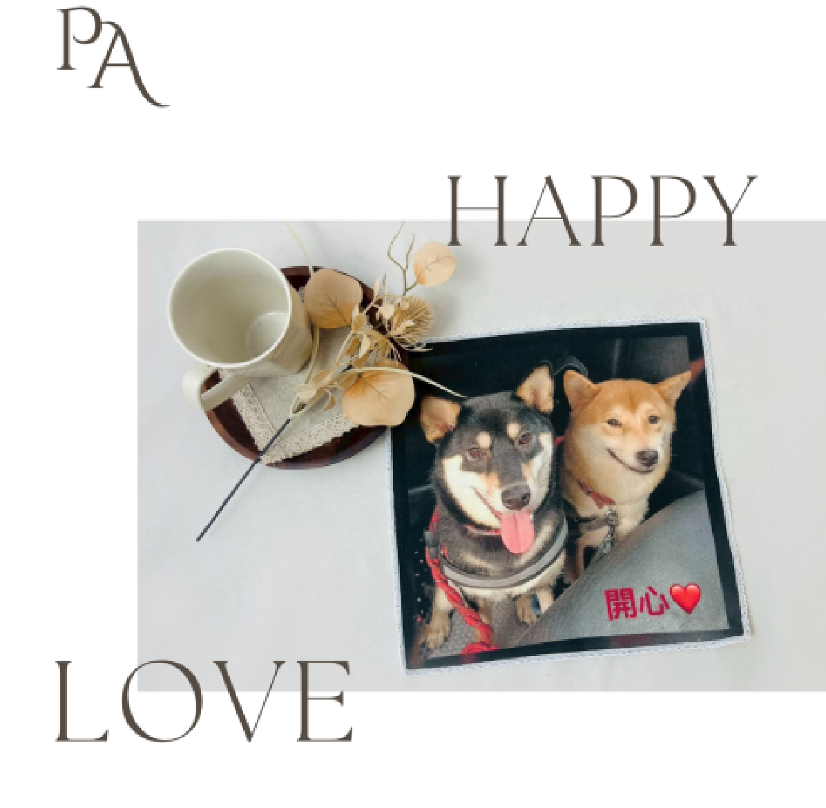 噴墨印刷就像家裡的印表機,色彩再複雜都能印,且「一條就能做」,適合追求獨特性、充滿細節的照片或插畫。圖為客戶的寵物寫真照印製小方巾。