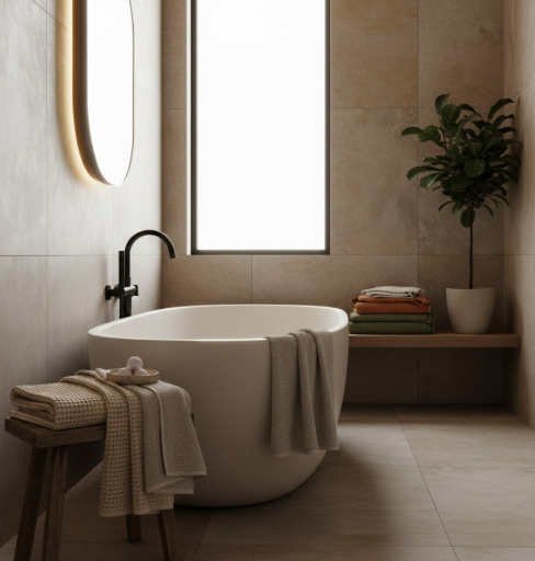 當毛巾的色澤能與牆面、光影自然呼應,浴室就不再只是單純的功能空間,而是一個屬於你,能容納情緒的溫柔場域。