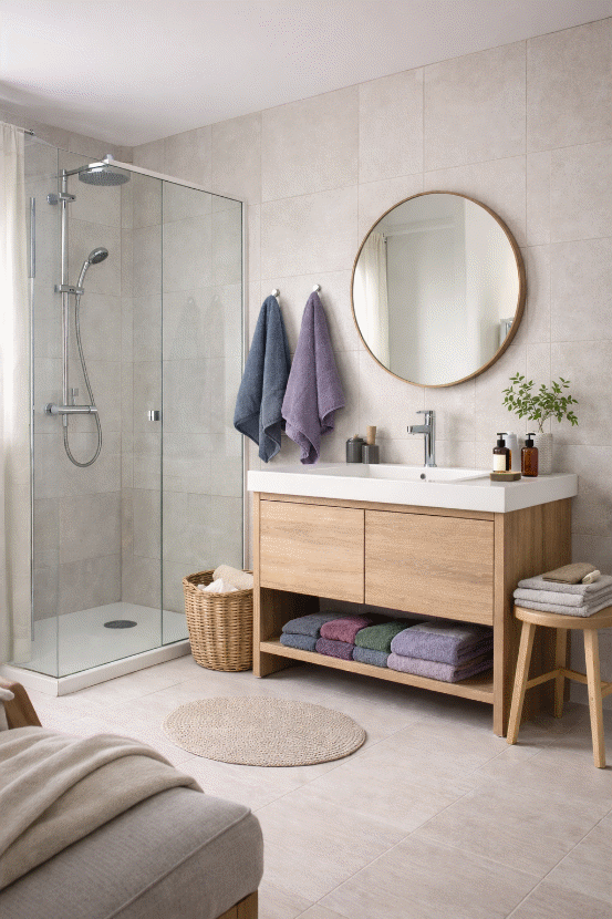 當低彩度的毛巾整齊疊放在開放式層架上,或輕輕掛在木質掛勾上,視覺不再跳脫,而是成為背景的一部分。柔軟的織紋在自然光下呈現溫潤光澤,既不喧賓奪主,也不顯單薄。這種「恰到好處」的存在感,正是北歐風空間的核心。