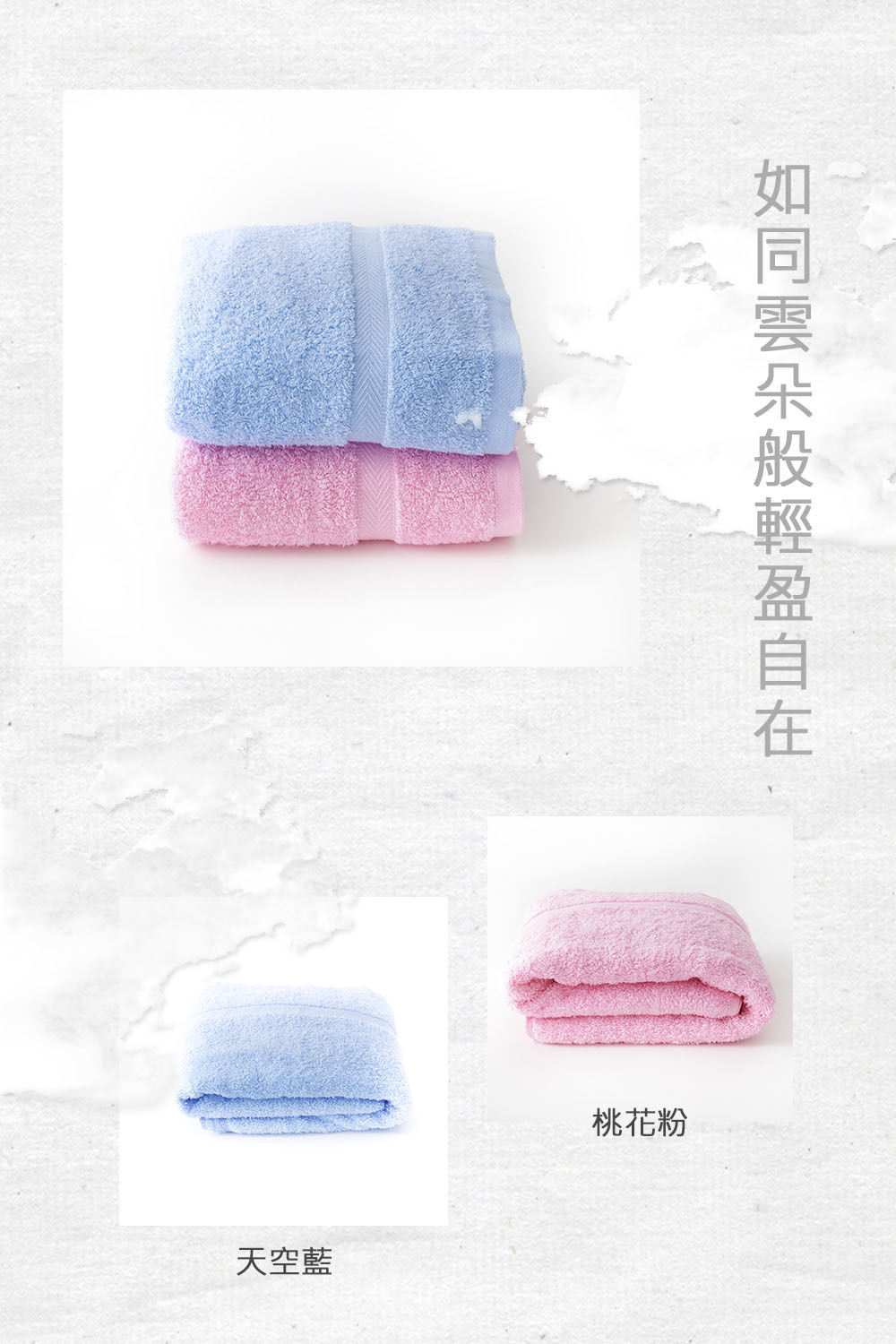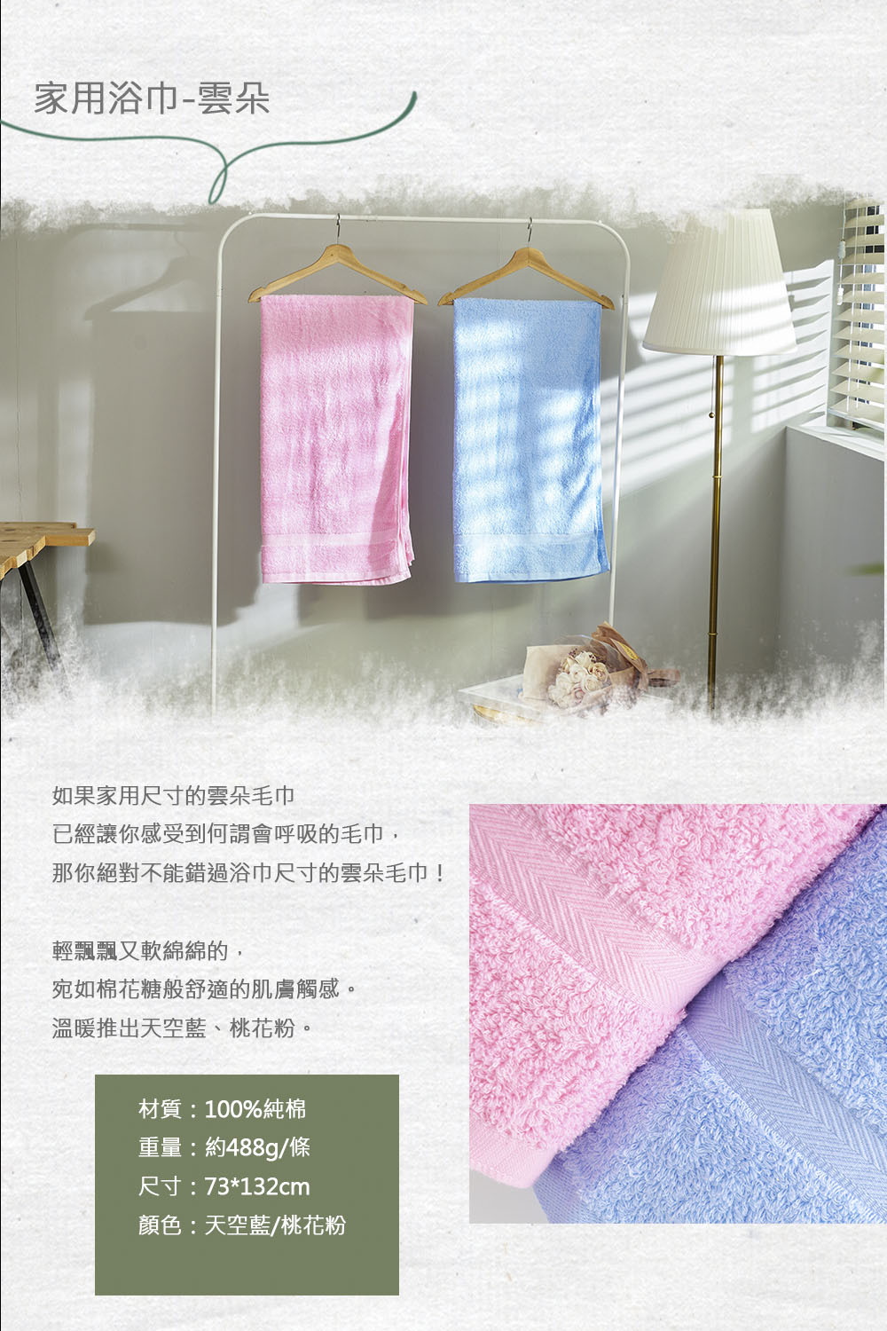 材質:100%純棉 重量:488g/條(±5%) 尺寸:73*132cm(±5%) 顏色:天空藍/桃花粉