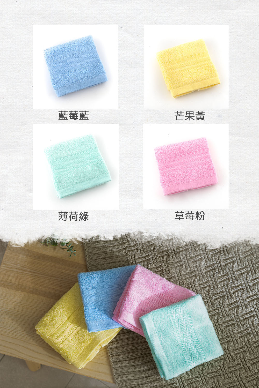 材質:100%純棉 重量:59g/條(±5%) 尺寸:28*54cm(±5%) 顏色:藍莓藍/芒果黃/ 薄荷綠/草莓粉