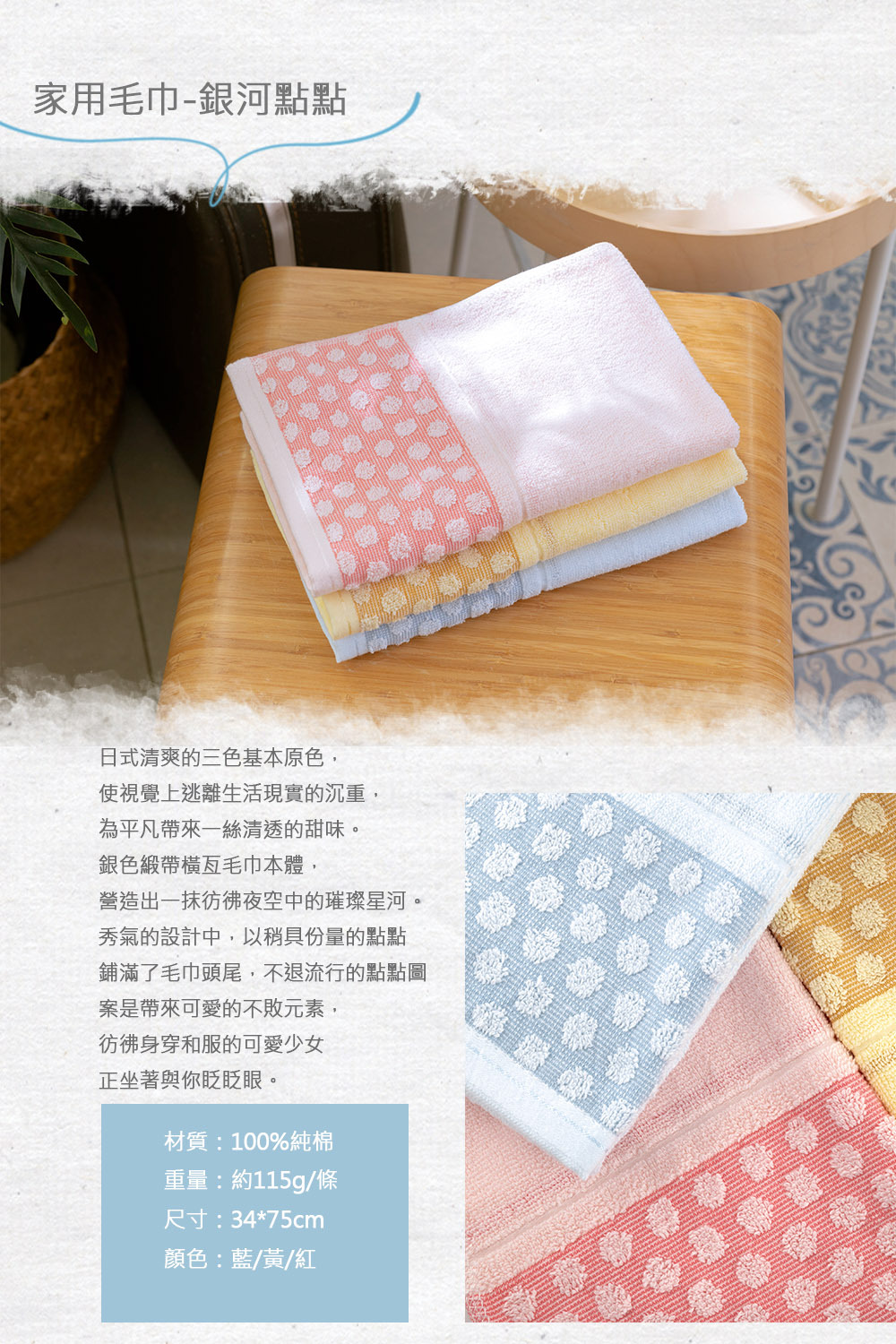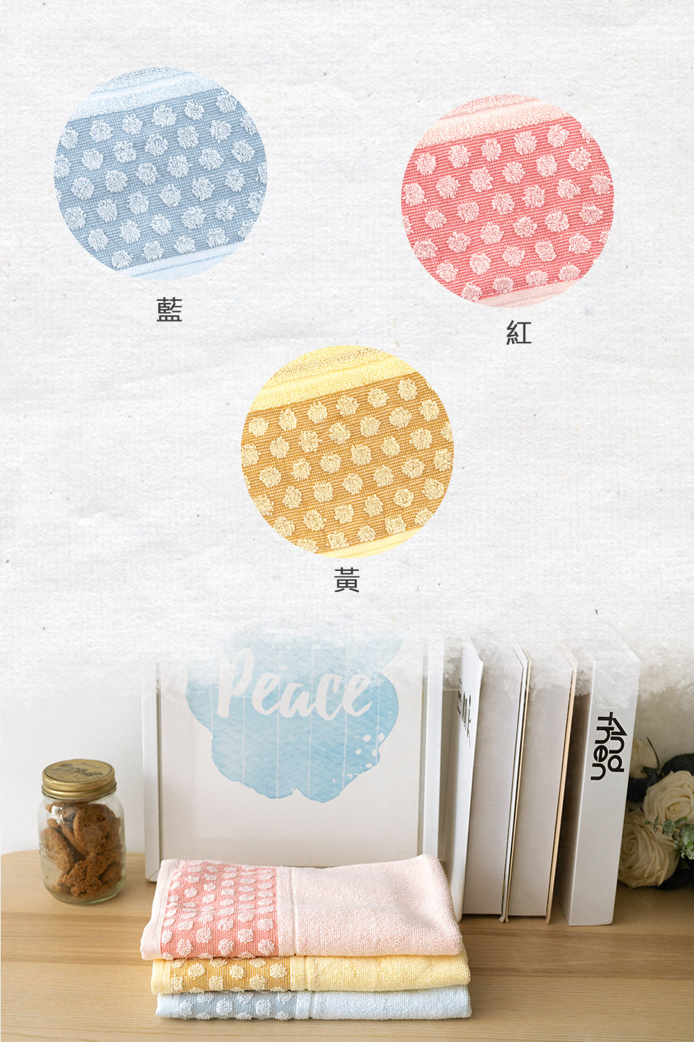 材質:100%純棉 重量:115g/條(±5%) 尺寸:34*75cm(±5%) 顏色:藍/黃/紅