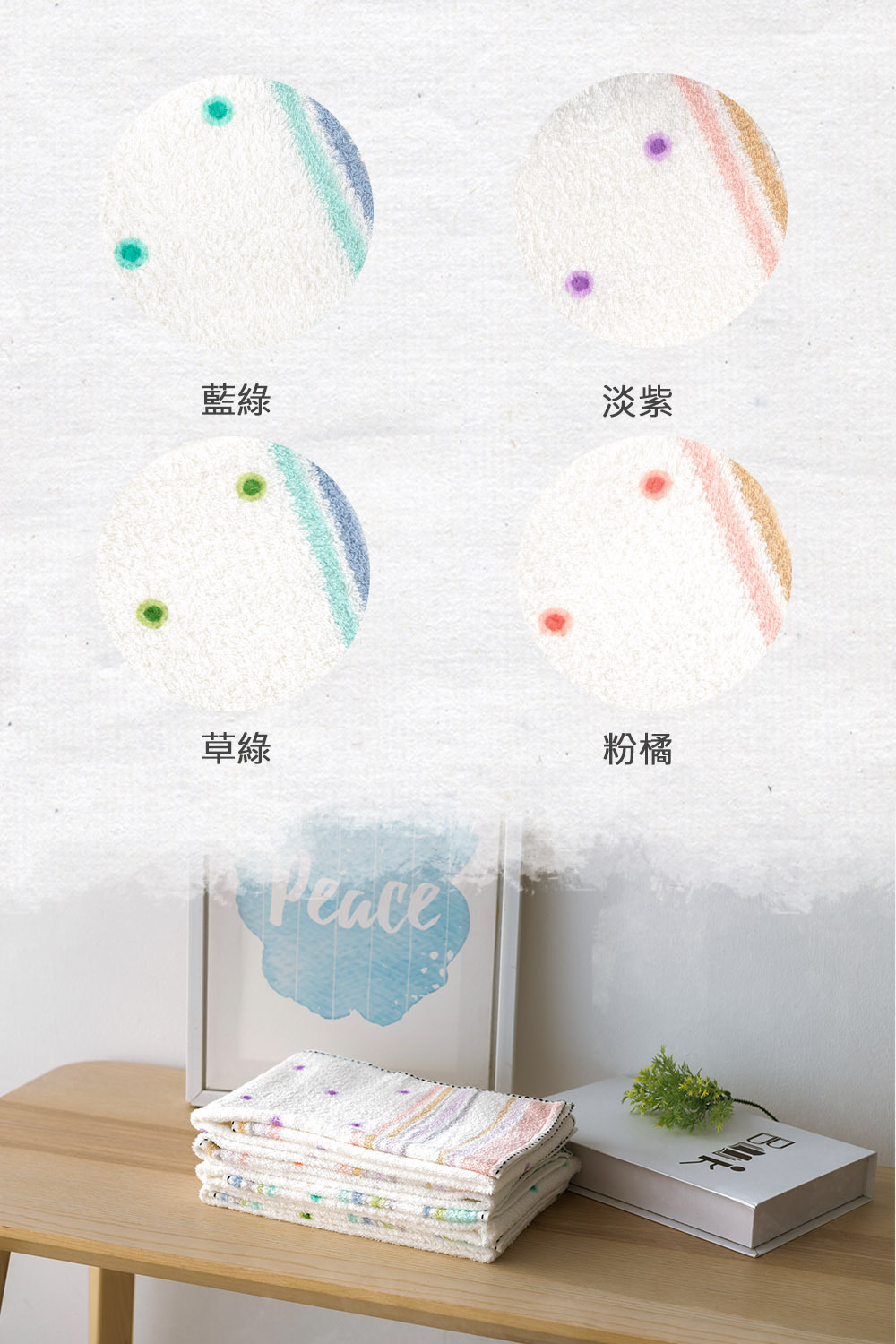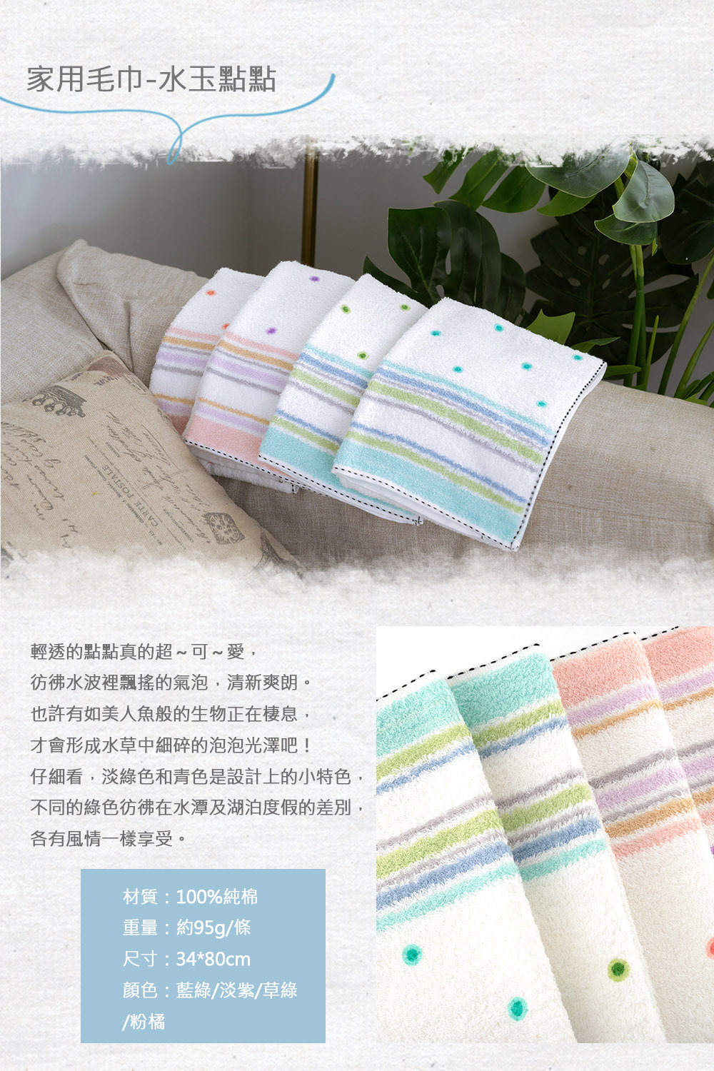 材質:100%純棉 重量:95g/條(±5%) 尺寸:34*80cm(±5%) 顏色:藍綠/淡紫/草綠/粉橘