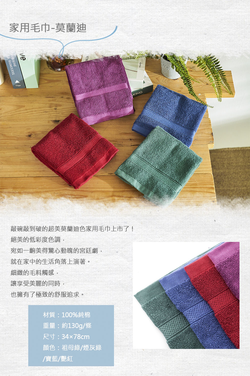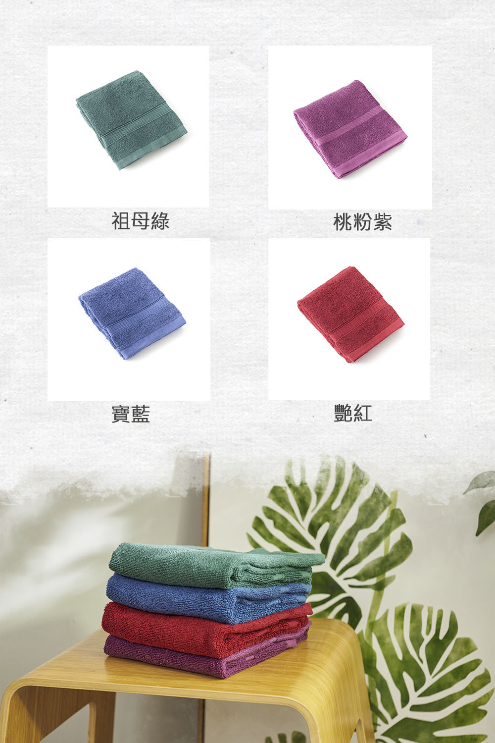 材質:100%純棉 重量:130g/條(±5%) 尺寸:34×78cm(±5%) 顏色:祖母綠/煙灰綠/寶藍/艷紅/桃粉紫