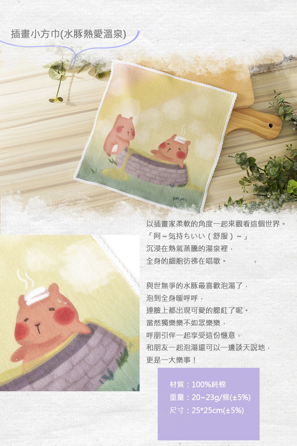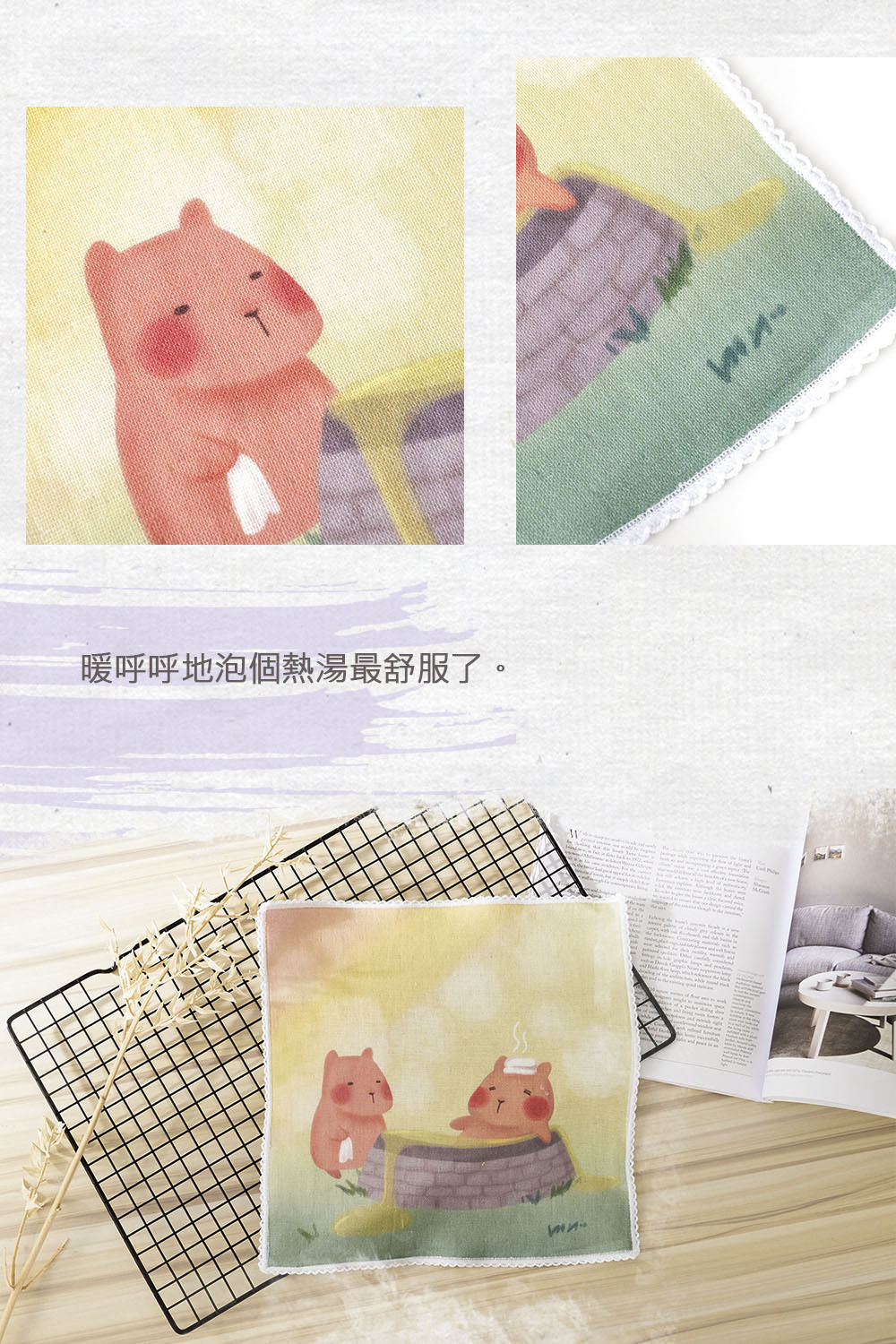 插畫小方巾(水豚熱愛溫泉)