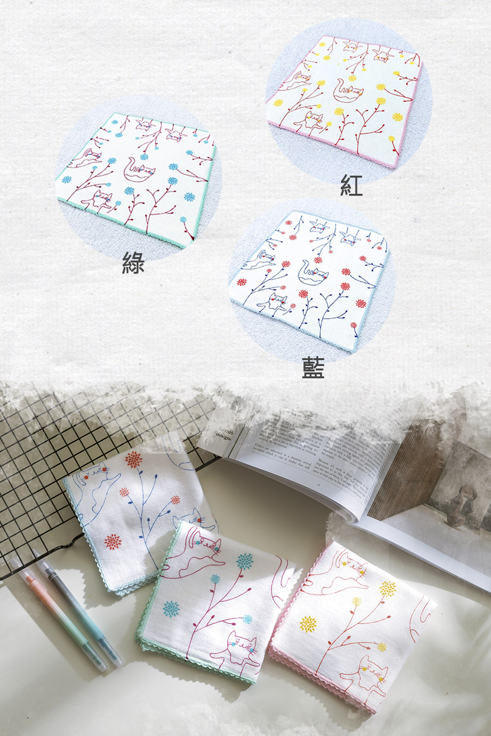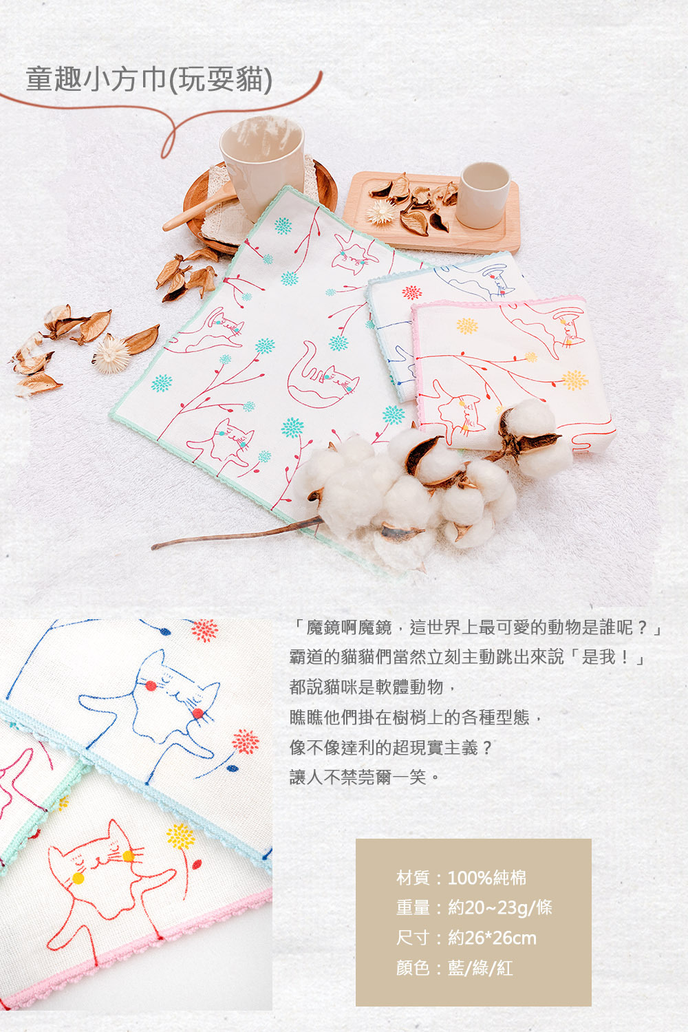 材質:100%純棉 重量:20~23g/條(±5%) 尺寸:26*26cm(±5%) 顏色:藍/綠/紅
