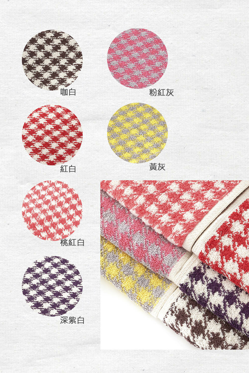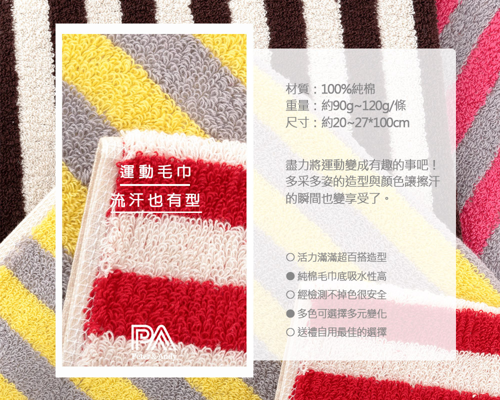 材質:100%純棉 重量:112g/條(±5%) 尺寸:22*100cm(±5%) 顏色:深紫白/咖白/粉紅灰/紅白/桃紅白/黃灰