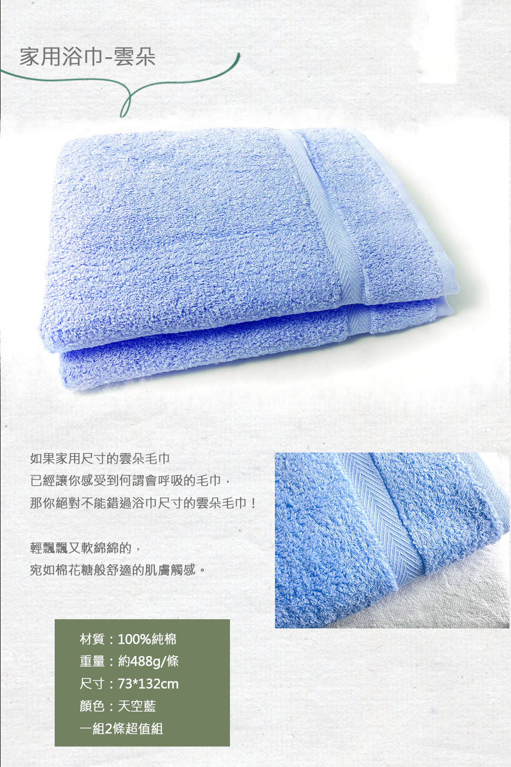 材質:100%純棉 重量:488g/條(±5%) 尺寸:73*132cm(±5%) 顏色:天空藍